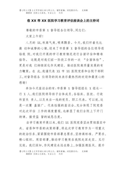 【七哥公文】2025年:在XX市XX医院学习教育评估座谈会上的主持词+更多免费公文+VX:QiGeGongWen2024