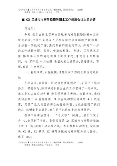 【七哥公文】2025年:在XX区城市内涝防控暨防溺水工作推进会议上的讲话+更多免费公文+VX:QiGeGongWen2024