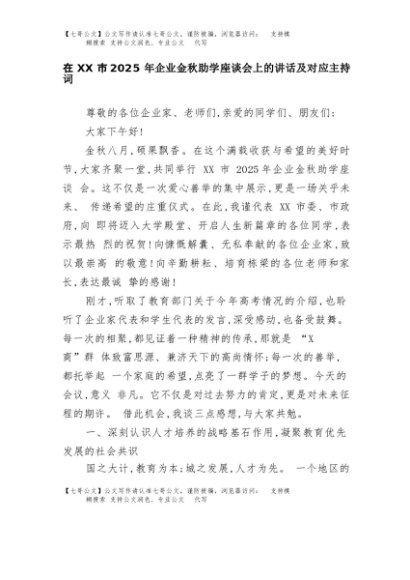 【七哥公文】2025年:在XX市2025年企业金秋助学座谈会上的讲话及对应主持词+更多免费公文+VX:QiGeGongWen2024