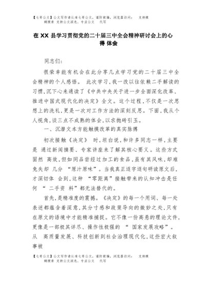 【七哥公文】2025年:在XX县学习贯彻党的二十届三中全会精神研讨会上的心得体会+更多免费公文+VX:QiGeGongWen2024