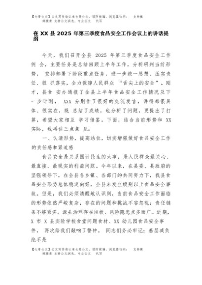 【七哥公文】2025年:在XX县2025年第三季度食品安全工作会议上的讲话提纲+更多免费公文+VX:QiGeGongWen2024
