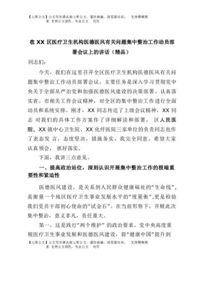 【七哥公文】2025年:在XX区医疗卫生机构医德医风有关问题集中整治工作动员部署会议上的讲话(精品)+更多免费公文+VX:QiGeGongWen2024