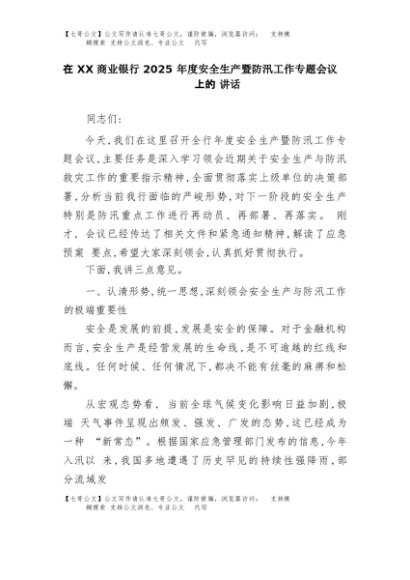 【七哥公文】2025年:在XX商业银行2025年度安全生产暨防汛工作专题会议上的讲话+更多免费公文+VX:QiGeGongWen2024
