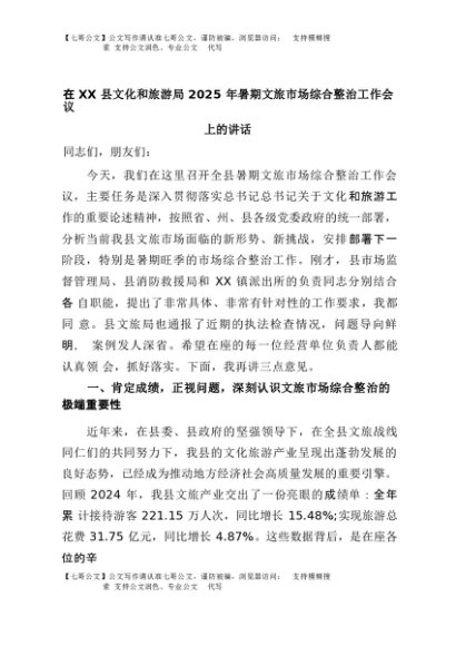 【七哥公文】2025年:在XX县文化和旅游局2025年暑期文旅市场综合整治工作会议上的讲话+更多免费公文+VX:QiGeGongWen2024