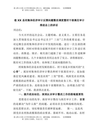【七哥公文】2025年:在XX县村集体经济审计反馈问题整改调度暨村干部离任审计推进会上的讲话+更多免费公文+VX:QiGeGongWen2024