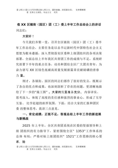 【七哥公文】2025年:在XX区镇街(园区)团(工)委上半年工作总结会上的讲话+更多免费公文+VX:QiGeGongWen2024