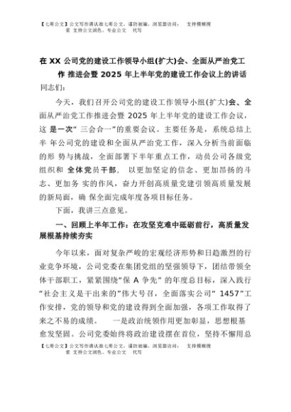 【七哥公文】2025年:在XX公司党的建设工作领导小组(扩大)会、全面从严治党工作推进会暨2025年上半年党的建设工作会议上的讲话+更多免费公文+VX:QiGeGongWen2024