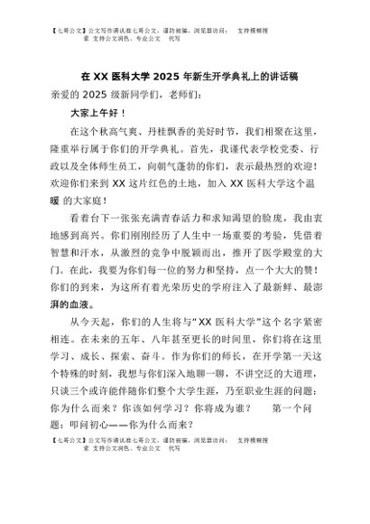 / 【七哥公文】2025年:在XX医科大学2025年新生开学典礼上的讲话稿+更多免费公文+VX:QiGeGongWen2024