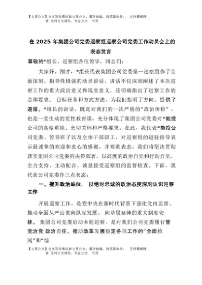 【七哥公文】2025年:在2025年集团公司党委巡察组巡察公司党委工作动员会上的表态发言+更多免费公文+VX:QiGeGongWen2024