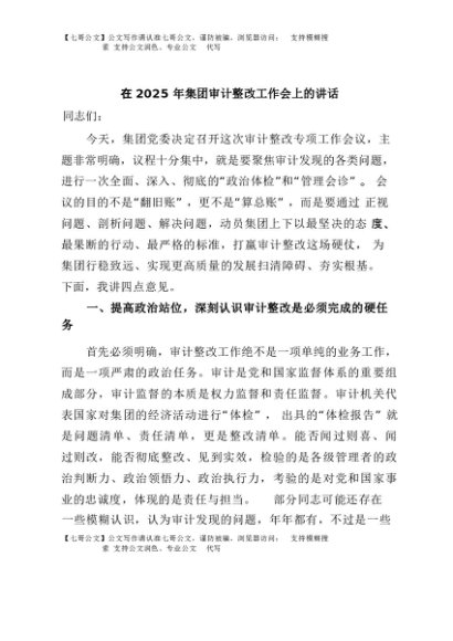 / 【七哥公文】2025年:在2025年集团审计整改工作会上的讲话+更多免费公文+VX:QiGeGongWen2024