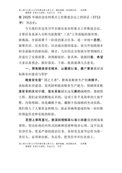 【七哥公文】2025年:在2025年镇农业农村重点工作推进会议上的讲话(3711字)+更多免费公文+VX:QiGeGongWen2024