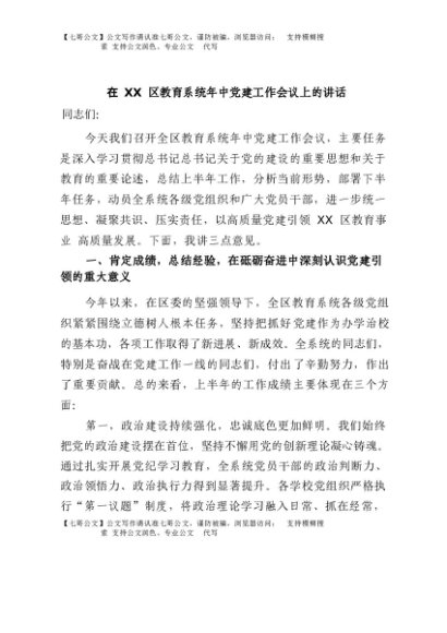 / 【七哥公文】2025年:在XX区教育系统年中党建工作会议上的讲话+更多免费公文+VX:QiGeGongWen2024
