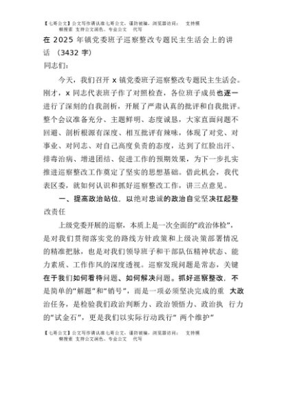 【七哥公文】2025年:在2025年镇党委班子巡察整改专题民主生活会上的讲话(3432字)+更多免费公文+VX:QiGeGongWen2024