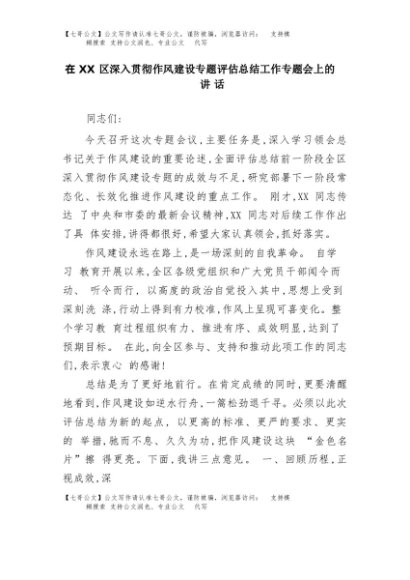 【七哥公文】2025年:在XX区深入贯彻作风建设专题评估总结工作专题会上的讲话+更多免费公文+VX:QiGeGongWen2024