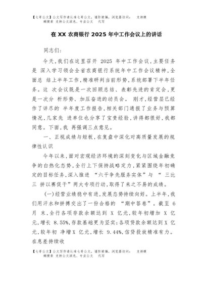 / 【七哥公文】2025年:在XX农商银行2025年中工作会议上的讲话+更多免费公文+VX:QiGeGongWen2024