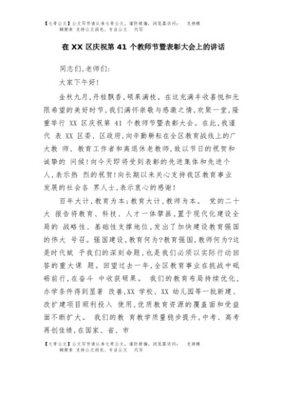 / 【七哥公文】2025年:在XX区庆祝第41个教师节暨表彰大会上的讲话+更多免费公文+VX:QiGeGongWen2024