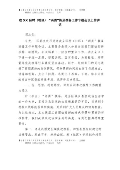 【七哥公文】2025年:在XX区村(社区)“两委”换届准备工作专题会议上的讲话+更多免费公文+VX:QiGeGongWen2024