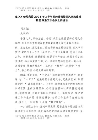 【七哥公文】2025年:在XX公司党委2025年上半年党的建设暨党风廉政建设和反腐败工作会议上的讲话+更多免费公文+VX:QiGeGongWen2024