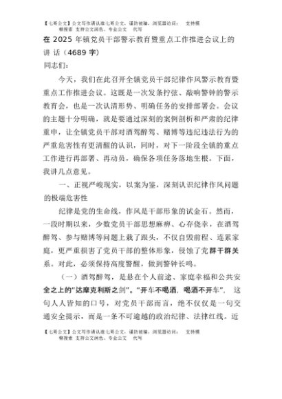 【七哥公文】2025年:在2025年镇党员干部警示教育暨重点工作推进会议上的讲话(4689字)+更多免费公文+VX:QiGeGongWen2024