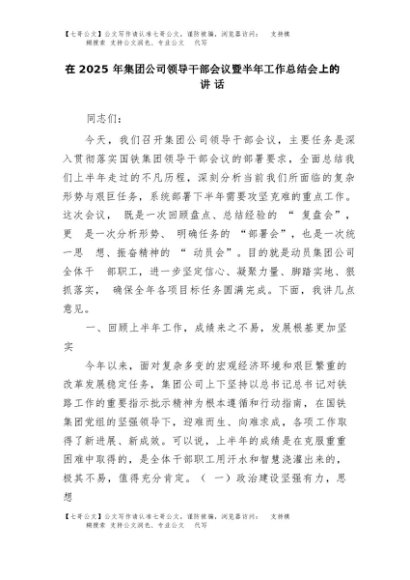 【七哥公文】2025年:在2025年集团公司领导干部会议暨半年工作总结会上的讲话+更多免费公文+VX:QiGeGongWen2024