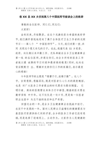 【七哥公文】2025年:在XX县XX乡庆祝第八个中国医师节座谈会上的致辞+更多免费公文+VX:QiGeGongWen2024
