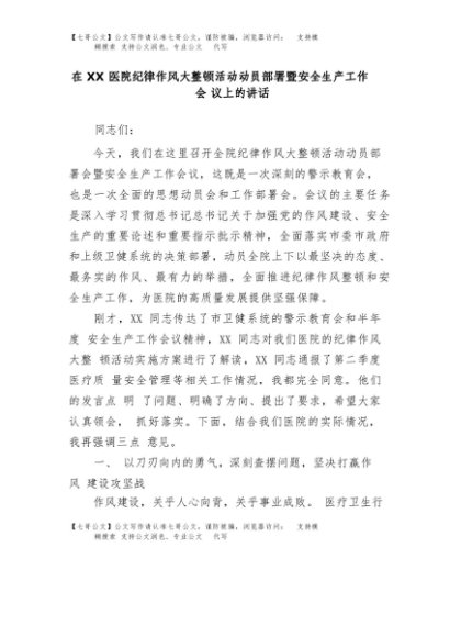【七哥公文】2025年:在XX医院纪律作风大整顿活动动员部署暨安全生产工作会议上的讲话+更多免费公文+VX:QiGeGongWen2024