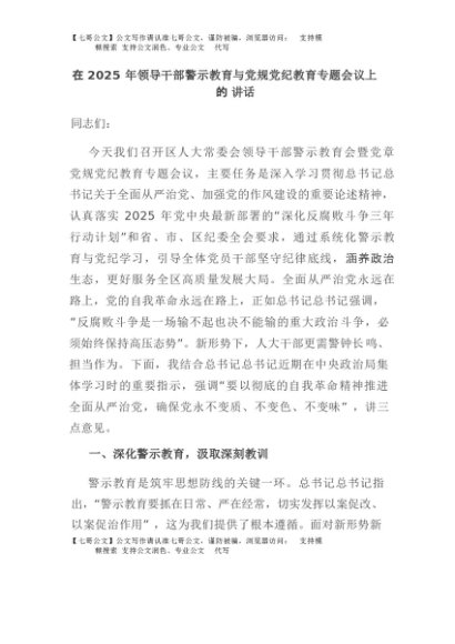 【七哥公文】2025年:在2025年领导干部警示教育与党规党纪教育专题会议上的讲话+更多免费公文+VX:QiGeGongWen2024