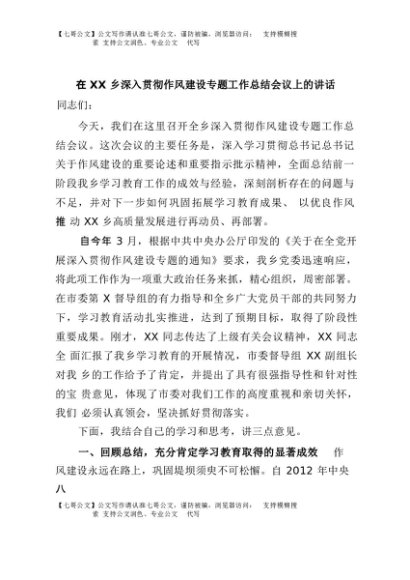 【七哥公文】2025年:在XX乡深入贯彻作风建设专题工作总结会议上的讲话+更多免费公文+VX:QiGeGongWen2024