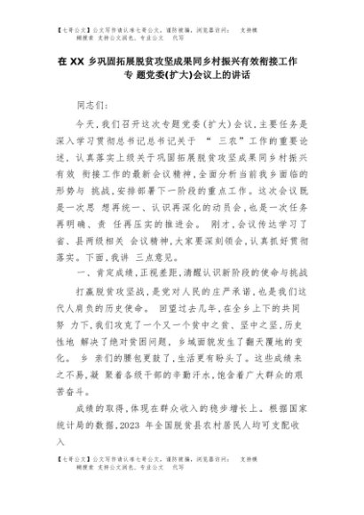 【七哥公文】2025年:在XX乡巩固拓展脱贫攻坚成果同乡村振兴有效衔接工作专题党委(扩大)会议上的讲话+更多免费公文+VX:QiGeGongWen2024