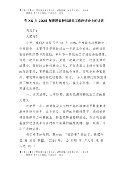 【七哥公文】2025年:在XX乡2025年度跨省转移就业工作座谈会上的讲话+更多免费公文+VX:QiGeGongWen2024
