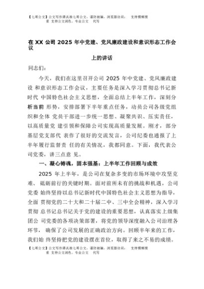 【七哥公文】2025年:在XX公司2025年中党建、党风廉政建设和意识形态工作会议上的讲话+更多免费公文+VX:QiGeGongWen2024