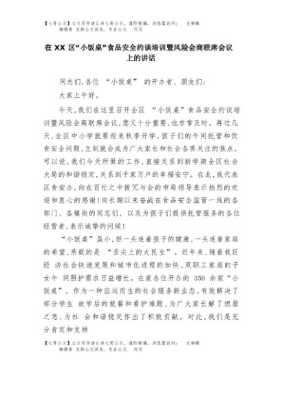 【七哥公文】2025年:在XX区“小饭桌”食品安全约谈培训暨风险会商联席会议上的讲话+更多免费公文+VX:QiGeGongWen2024
