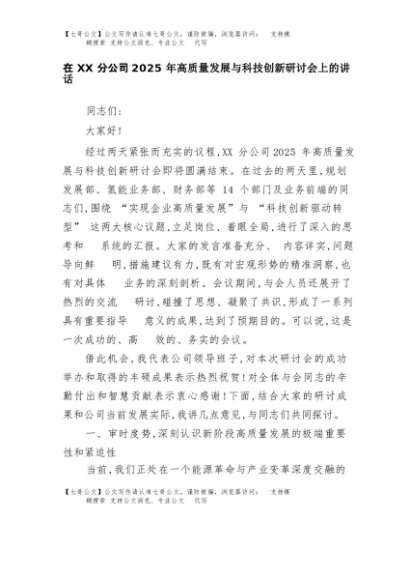 【七哥公文】2025年:在XX分公司2025年高质量发展与科技创新研讨会上的讲话+更多免费公文+VX:QiGeGongWen2024