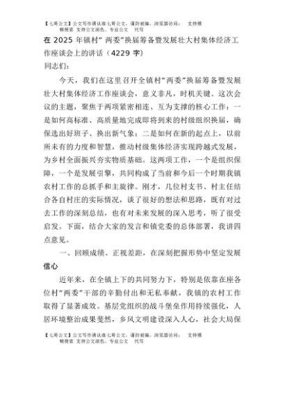 【七哥公文】2025年:在2025年镇村“两委”换届筹备暨发展壮大村集体经济工作座谈会上的讲话(4229字)+更多免费公文+VX:QiGeGongWen2024