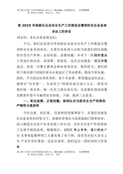 【七哥公文】2025年:在2025年高新区企业安全生产工作推进会暨消防安全业务培训会上的讲话+更多免费公文+VX:QiGeGongWen2024
