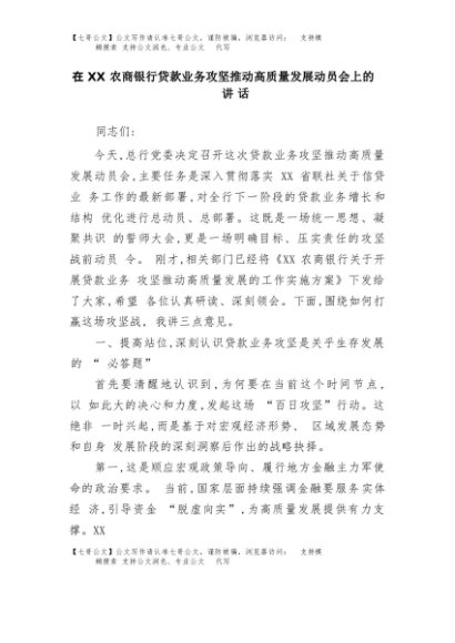 【七哥公文】2025年:在XX农商银行贷款业务攻坚推动高质量发展动员会上的讲话+更多免费公文+VX:QiGeGongWen2024