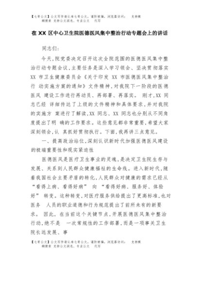 【七哥公文】2025年:在XX区中心卫生院医德医风集中整治行动专题会上的讲话+更多免费公文+VX:QiGeGongWen2024