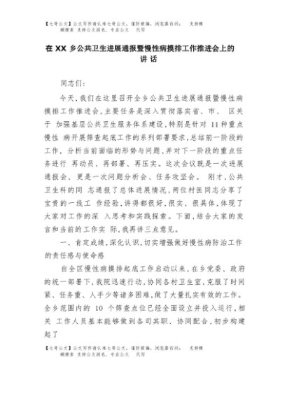 【七哥公文】2025年:在XX乡公共卫生进展通报暨慢性病摸排工作推进会上的讲话+更多免费公文+VX:QiGeGongWen2024