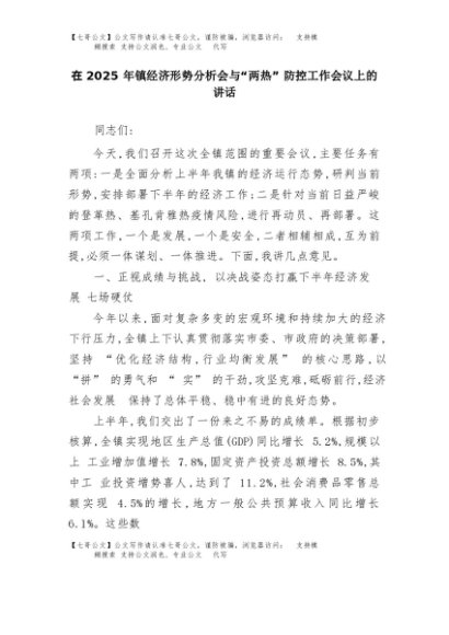【七哥公文】2025年:在2025年镇经济形势分析会与“两热”防控工作会议上的讲话+更多免费公文+VX:QiGeGongWen2024