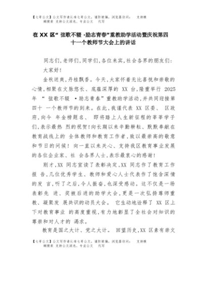 【七哥公文】2025年:在XX区“弦歌不辍·励志青春”重教助学活动暨庆祝第四十一个教师节大会上的讲话+更多免费公文+VX:QiGeGongWen2024