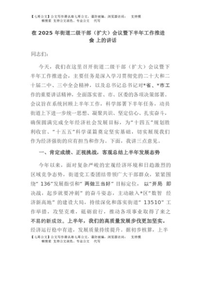 【七哥公文】2025年:在2025年街道二级干部(扩大)会议暨下半年工作推进会上的讲话+更多免费公文+VX:QiGeGongWen2024