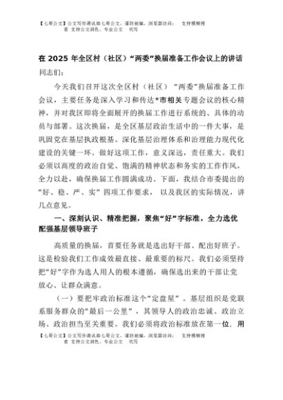 【七哥公文】2025年:在2025年全区村(社区)“两委”换届准备工作会议上的讲话+更多免费公文+VX:QiGeGongWen2024