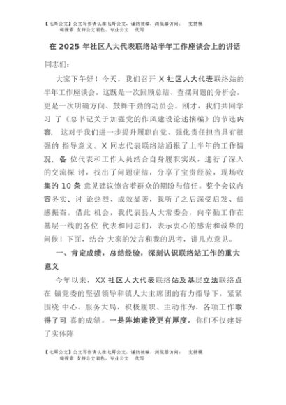 【七哥公文】2025年:在2025年社区人大代表联络站半年工作座谈会上的讲话+更多免费公文+VX:QiGeGongWen2024