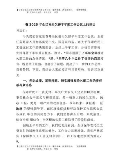 / 【七哥公文】2025年:在2025年全区根治欠薪半年度工作会议上的讲话+更多免费公文+VX:QiGeGongWen2024