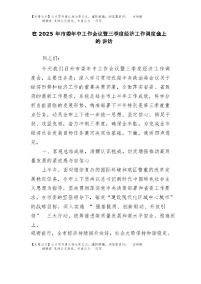 【七哥公文】2025年:在2025年市委年中工作会议暨三季度经济工作调度会上的讲话+更多免费公文+VX:QiGeGongWen2024