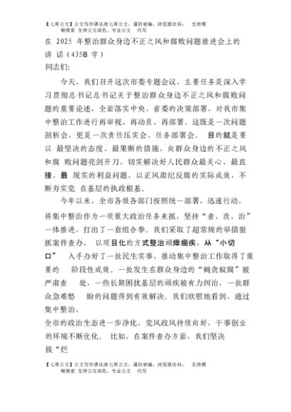 【七哥公文】2025年:在2025年整治群众身边不正之风和腐败问题推进会上的讲话(4358字)+更多免费公文+VX:QiGeGongWen2024