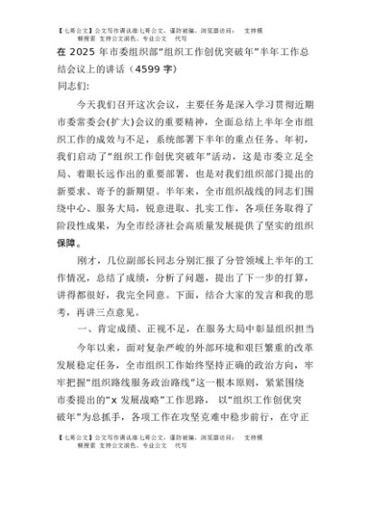【七哥公文】2025年:在2025年市委组织部“组织工作创优突破年”半年工作总结会议上的讲话(4599字)+更多免费公文+VX:QiGeGongWen2024