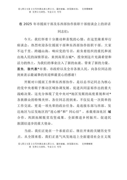 【七哥公文】2025年:在2025年市援派干部及东西部协作挂职干部座谈会上的讲话+更多免费公文+VX:QiGeGongWen2024