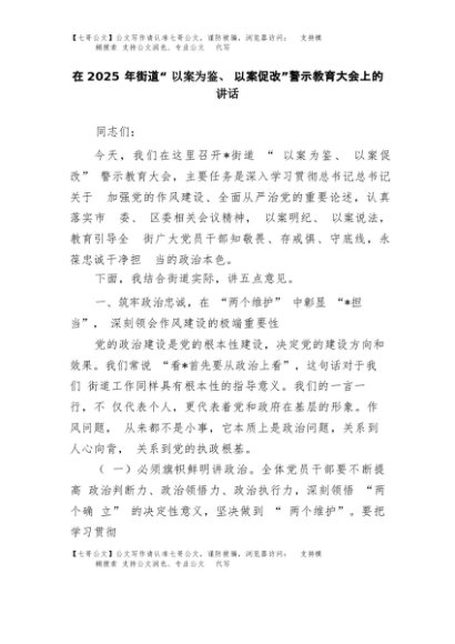 【七哥公文】2025年:在2025年街道“以案为鉴、以案促改”警示教育大会上的讲话+更多免费公文+VX:QiGeGongWen2024
