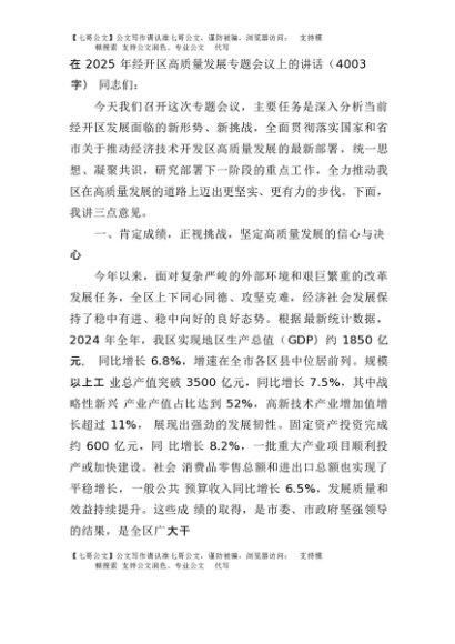【七哥公文】2025年:在2025年经开区高质量发展专题会议上的讲话(4003字)+更多免费公文+VX:QiGeGongWen2024